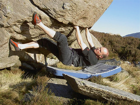 Adam Hocking on the crux section of the Kingdom of Pain hard V10/7c+, Main Block, Sheep Pen boulders, Ogwen Valley photo: Si Panton