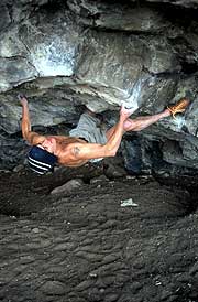Chris Davies pulling down hard, back in the day on Parisella's Cave classic, Lou Ferrino (V10) (photo: Ray Wood)