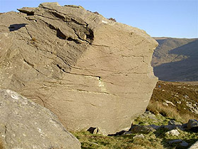 The main face has a good problem through the centre and another up the right hand side. Hones will affect a traverse of the break. The roof to the right is untouched as far as the Boulder of the Month staff are aware. Find it at gr 655566.