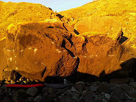 Dringo Gaeaf V5/6C starts standing down in the pit with spike hold around to left for the left hand. Climb straight up the prow via a deadpoint to a high right edge and slightly highball top out.